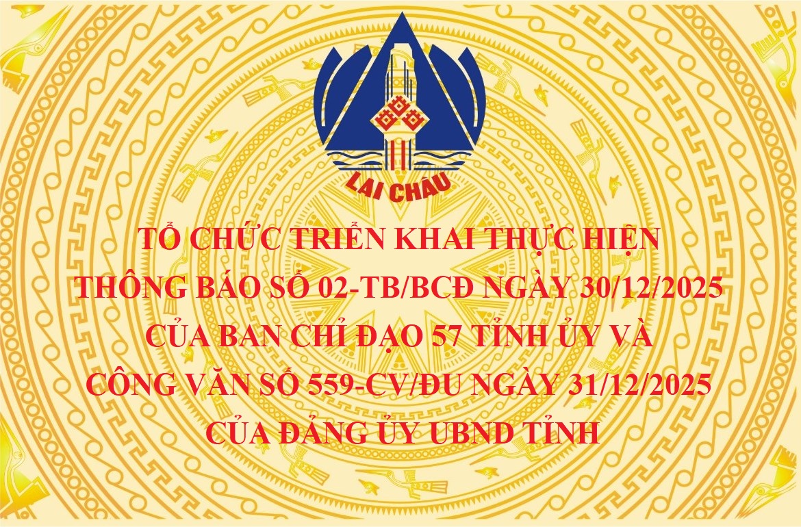 Ngày 31/12/2025, Văn phòng UBND tỉnh Lai Châu đã ban hành Kế hoạch số 1912/VPUBND-HCQT về tổ chức triển khai thực hiện Thông báo số 02-TB/BCĐ ngày 30/12/2025 của Ban Chỉ đạo 57 Tỉnh ủy và Công văn số 559-CV/ĐU ngày 31/12/2025 của Đảng ủy UBND tỉnh.