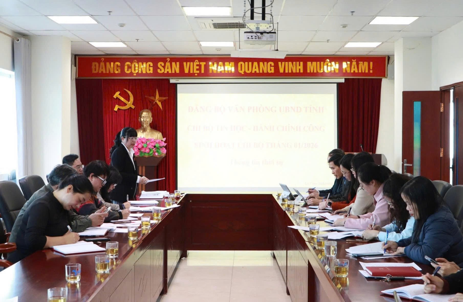 Buổi sinh hoạt được tổ chức nghiêm túc, đúng quy trình, nội dung theo hướng dẫn của cấp ủy cấp trên. Chi bộ Tin học - Hành chính công đã thông tin tình hình thời sự trong tỉnh, trong nước, quốc tế; phổ biến, quán triệt các văn bản mới của Trung ương, của tỉnh, của Đảng ủy UBND tỉnh và Đảng ủy Văn phòng UBND tỉnh; đánh giá tình hình tư tưởng của đảng viên, quần chúng; những vấn đề chi bộ cần quan tâm; định hướng nhận thức, tư tưởng cho đảng viên; đánh giá kết quả công tác lãnh đạo thực hiện nhiệm vụ chính trị trong tháng 1/2026 của Chi bộ và việc thực hiện nhiệm vụ của đảng viên; đánh giá việc thực hiện Nghị quyết, Kết luận Trung ương 4 khóa XI, XII, XIII một số vấn đề cấp bách về xây dựng Đảng hiện nay gắn với thực hiện Kết luận số 01-KL/TW, ngày 18/5/2021 của Bộ Chính trị về tiếp tục thực hiện Chỉ thị số 05-CT/TW của Bộ Chính trị “Về đẩy mạnh học tập và làm theo tư tưởng, đạo đức, phong cách Hồ Chí Minh”; đánh giá việc thực hiện nội dung theo Kết luận Trung ương 4 khóa XIII; về những điều đảng viên không được làm và các quy định về trách nhiệm nêu gương theo quy định của Ban Chấp hành Trung ương, Bộ Chính trị; về chống chạy chức, chạy quyền và chống chủ nghĩa cá nhân, quan liêu, xa rời quần chúng...