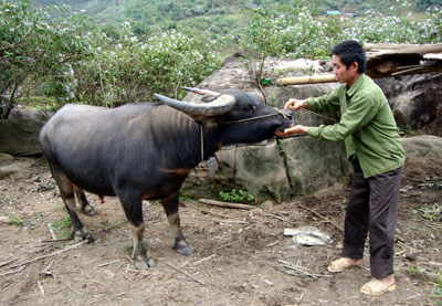 | Gia đình ông Lò Văn Pánh, ở bản Nậm Mạ Thái tự chữa trị cho trâu. |