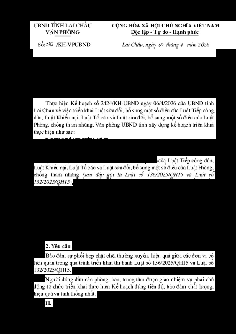 | Tiêu đề văn bản | Kế hoạch Triển khai Luật sửa đổi, bổ sung một số điều của Luật Tiếp công dân, Luật Khiếu nại, Luật Tố cáo và Luật sửa đổi, bổ sung một số điều của Luật Phòng, chống tham nhũng | ||